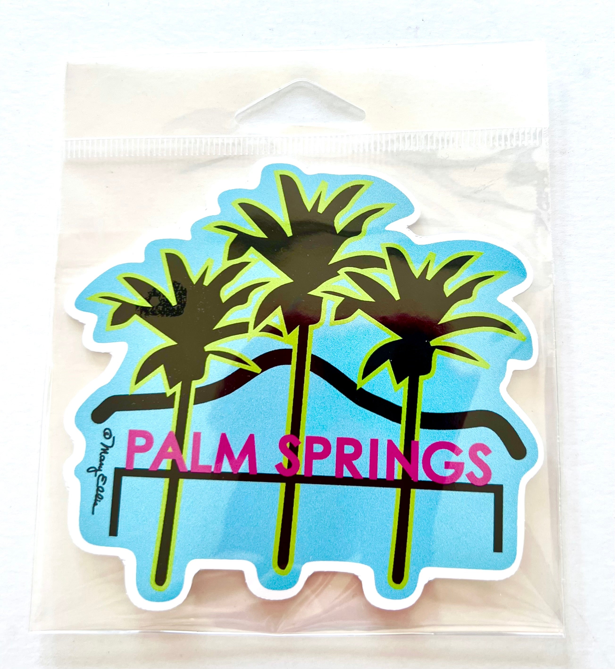 Palm Springs Sign Giant 4" Sticker with bright and glossy artwork by artist Mary Ellis. This big sticker makes a perfect collectible Palm Springs California souvenir gift. Perfect to stick on a water bottle, notebook, or wherever you can imagine! ...