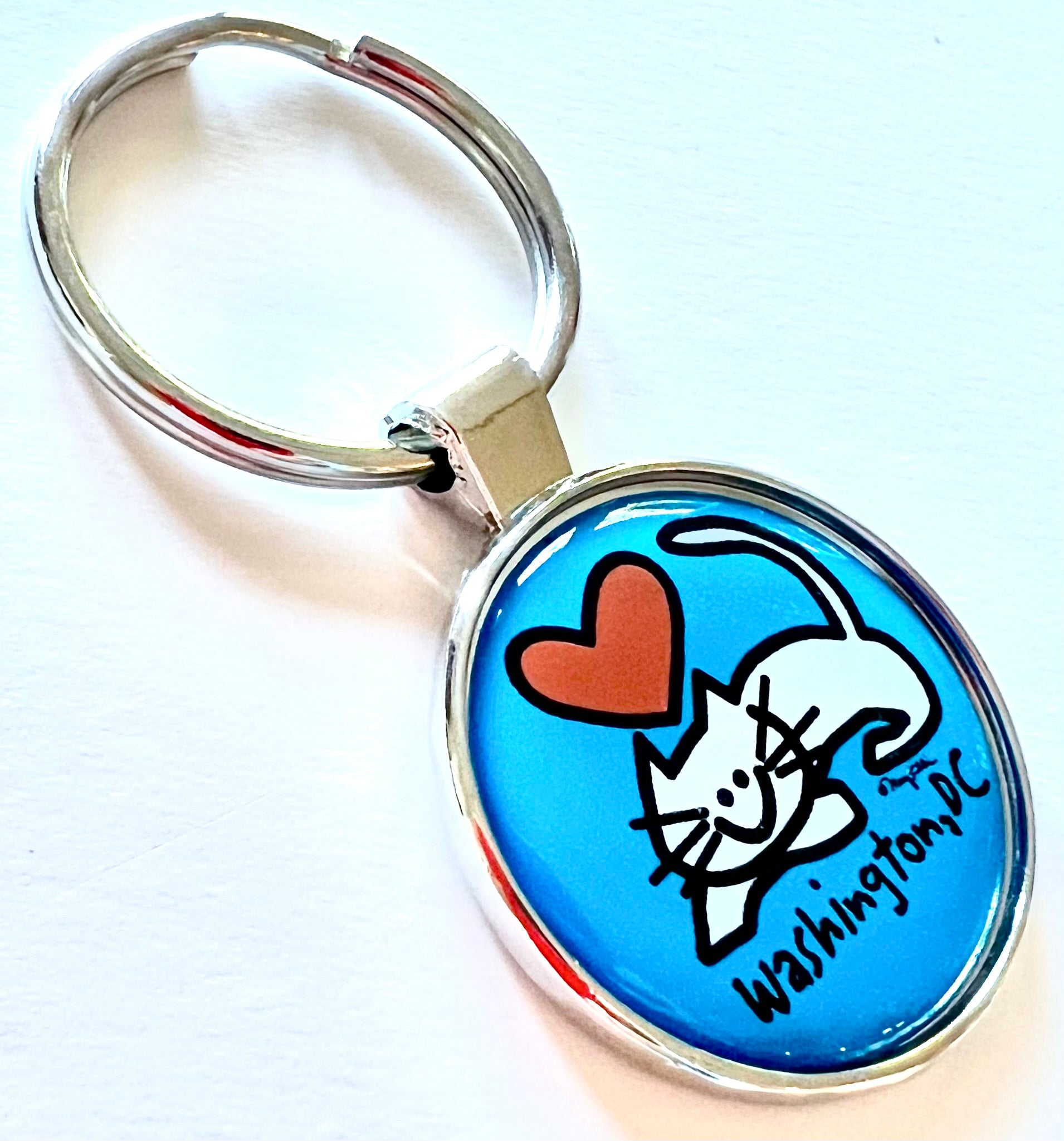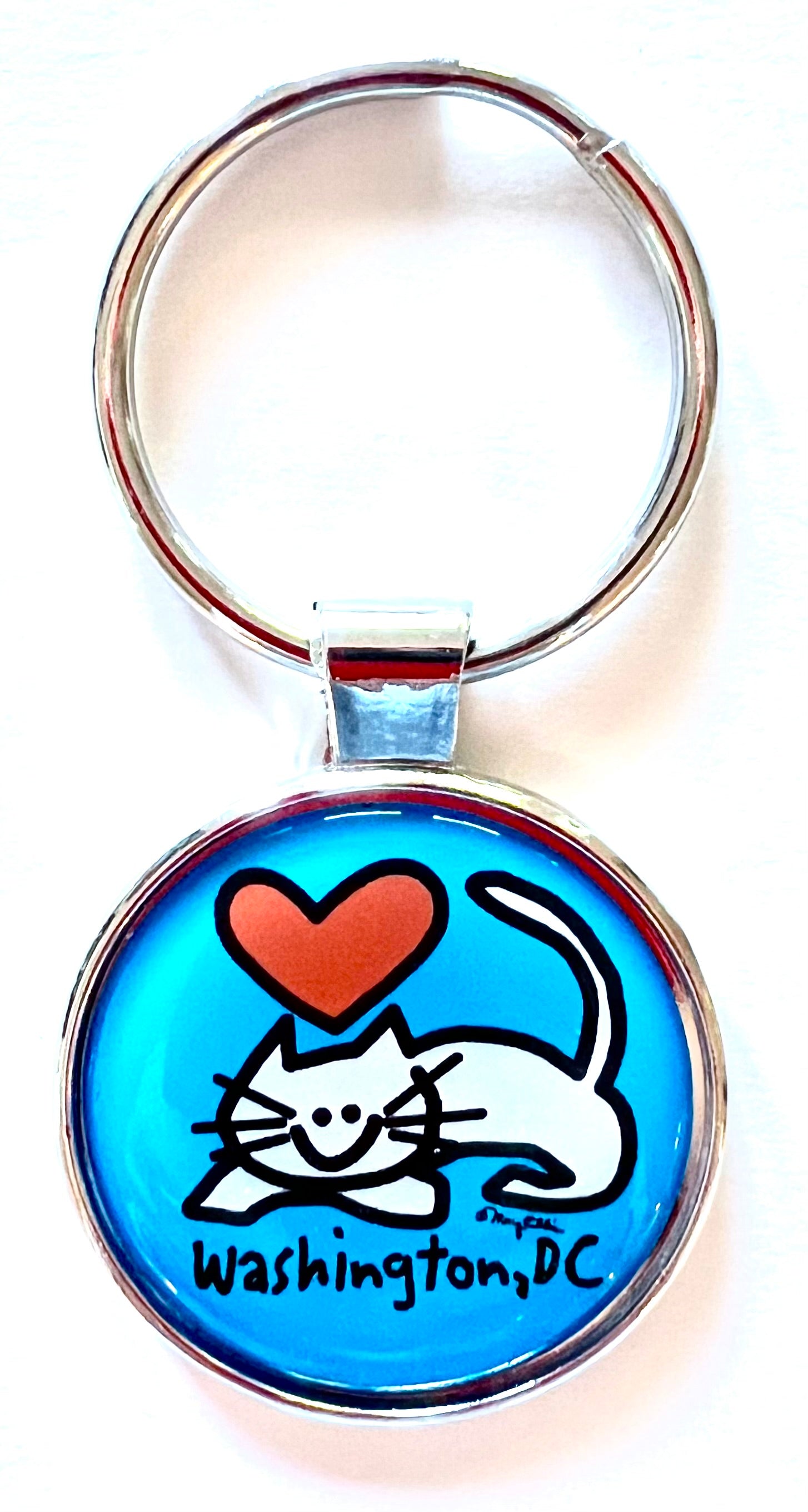 Washington DC Cat Keychain with artwork created by artist Mary Ellis. This metal keychain measures 1.25 inches by 2.5 inches and features a hard resin dome finish and shiny reflective chrome metal backing. Made in the USA. Make a perfect...