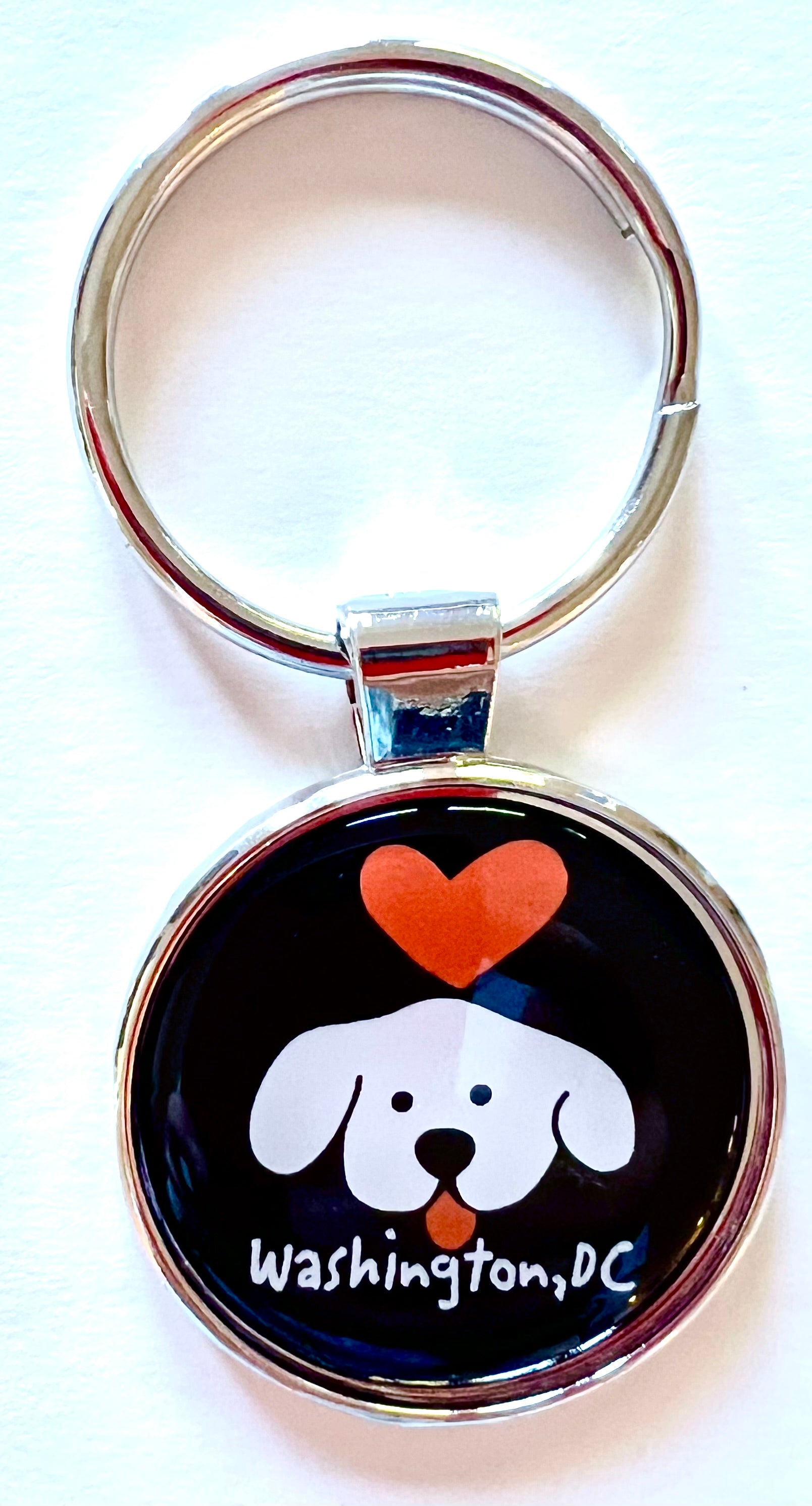 Washington DC Dog Keychain with artwork created by artist Mary Ellis. This metal keychain measures 1.25 inches by 2.5 inches and features a hard resin dome finish and shiny reflective chrome metal backing. Made in the USA. Make a perfect...