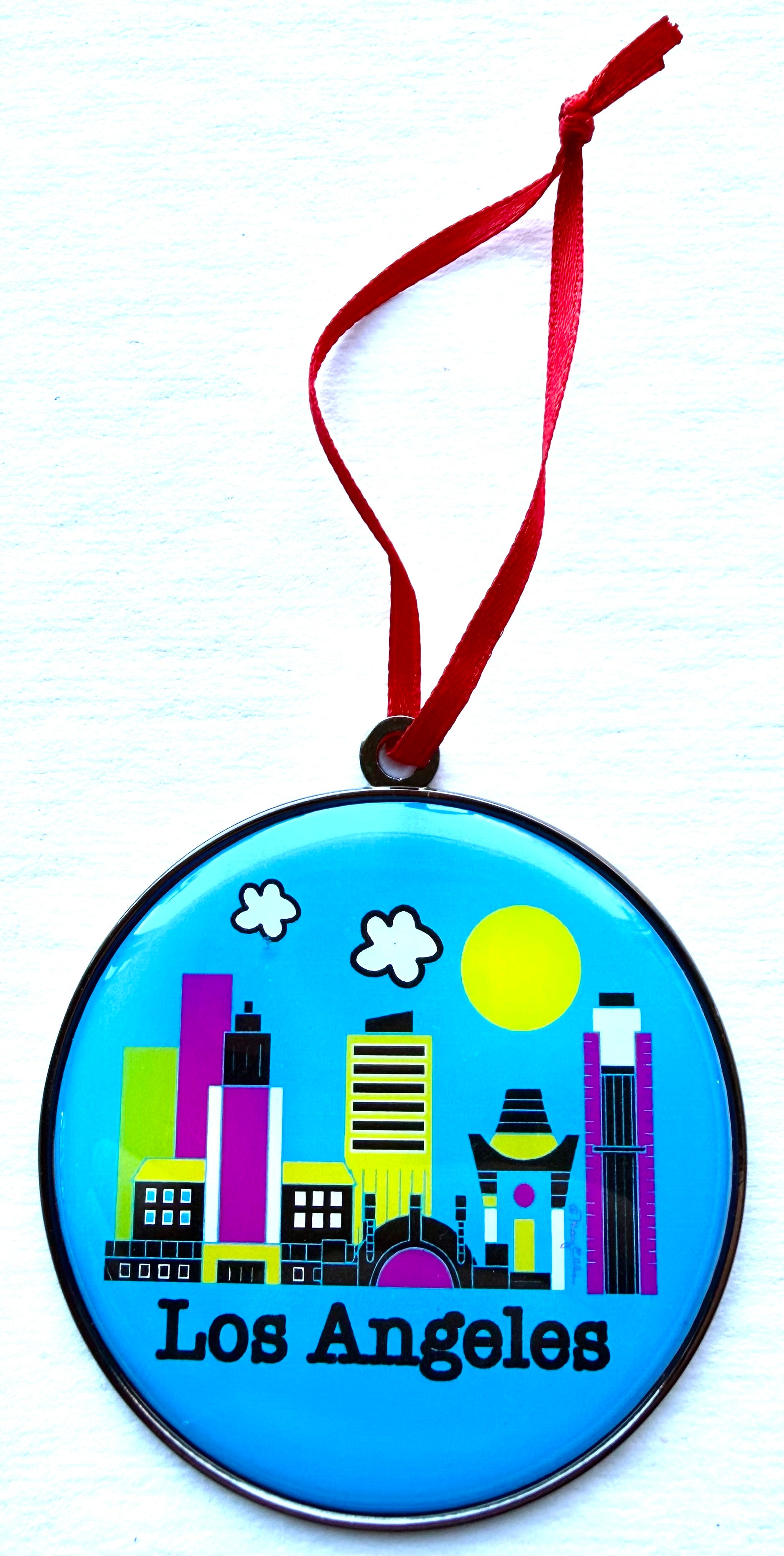 2.5" Los Angeles Skyline Christmas Dome Ornament created by artist Mary Ellis. This ornament features a protective resin rounded dome, reflective metal backing, and comes with an attached red ribbon for hanging. Makes the perfect Los Angeles Souvenir Christmas gift....