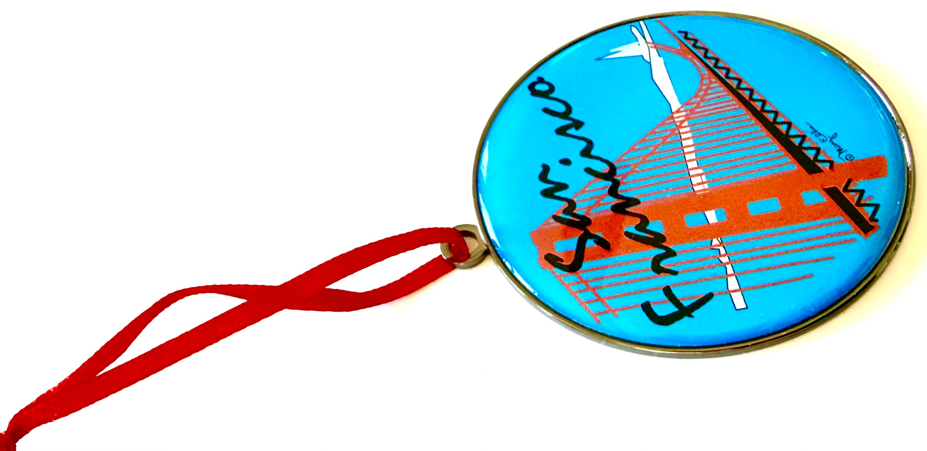 2.5" San Francisco Golden Gate Bridge Christmas Dome Ornament created by artist Mary Ellis. This ornament features a protective resin rounded dome, reflective metal backing, and comes with an attached red ribbon for hanging. Makes the perfect San Francisco Souvenir...