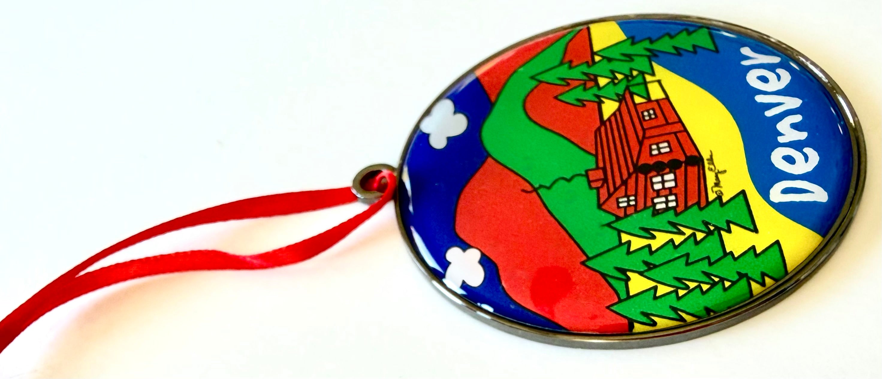2.5" Love From Denver Faces Christmas Dome Ornament created by artist Mary Ellis. This ornament features a protective resin rounded dome, reflective metal backing, and comes with an attached red ribbon for hanging. Makes the perfect Denver Souvenir Christmas gift....