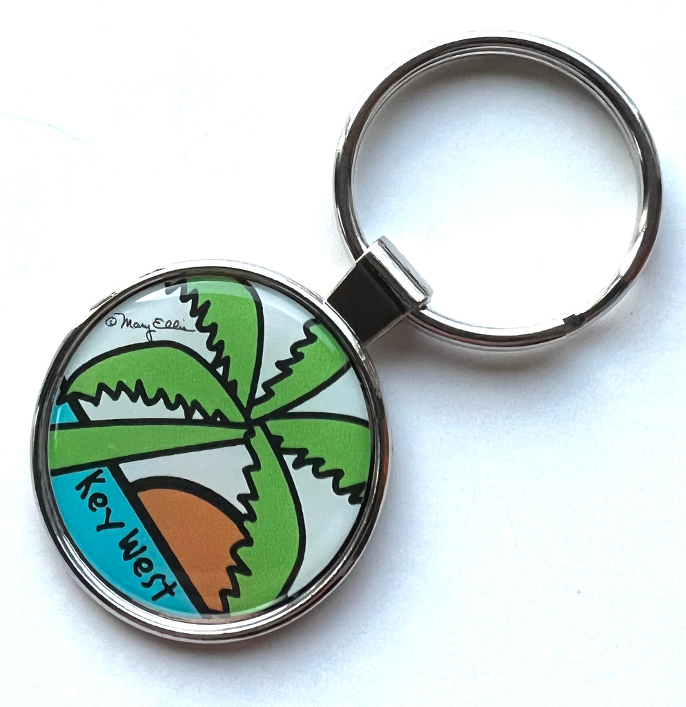 Key West Florida Keychain with Palm Tree Sunset by Mary Ellis. This metal keychain measures 1.25 inches by 2.25 inches and features a hard clear resin dome and shiny reflective chrome backing. Makes the perfect souvenir gift. Carry around a little piece of Key West with you wherever you go.