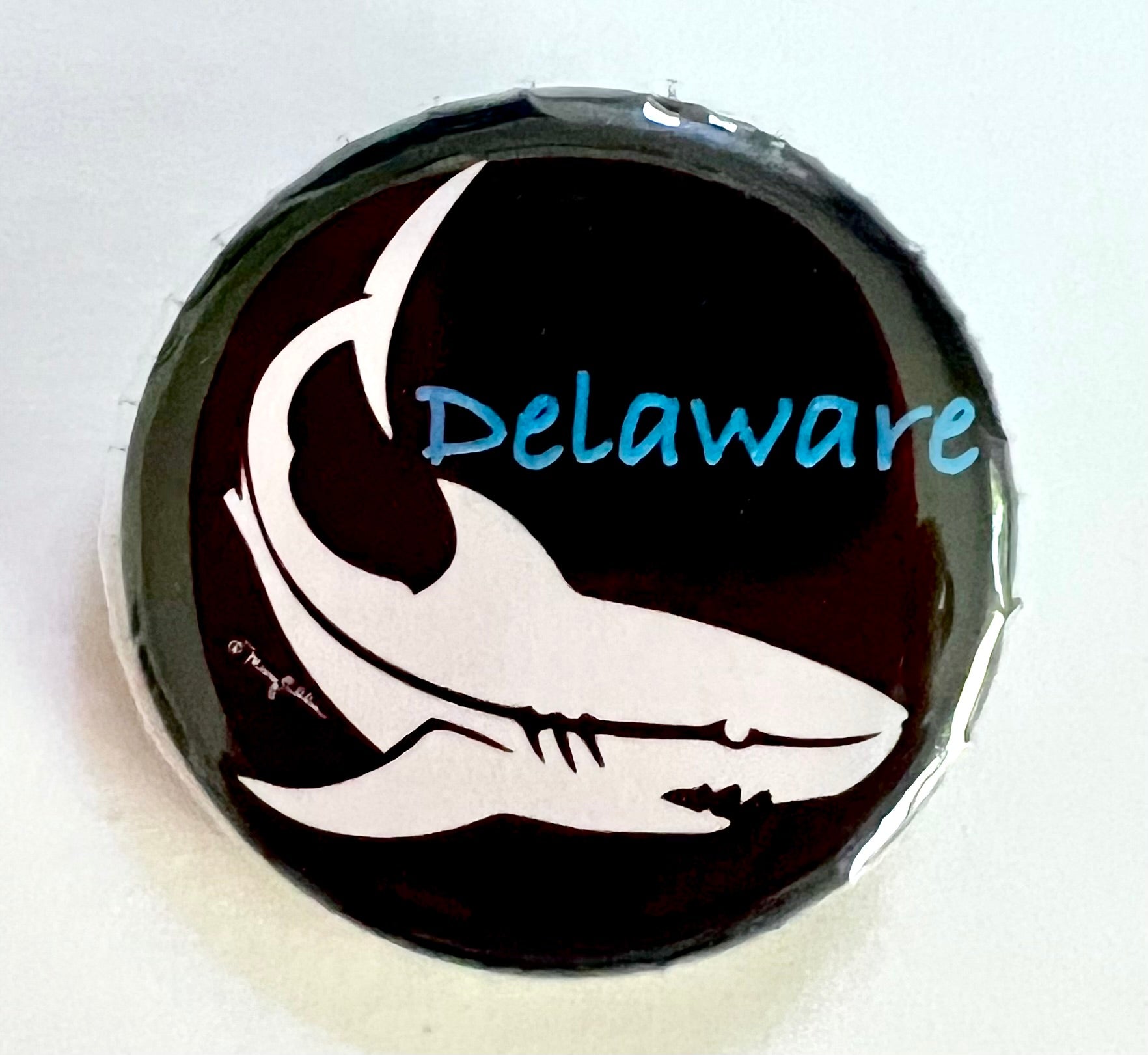 Set of 4 Delaware mini buttons featuring Mary Ellis' iconic artwork. Each metal button measures 1.25 inches with pin backing. Each button set includes 4 of Mary's most popular Delaware designs including: Delaware Shark, Delaware Racing, Delaware Seagulls, and Delaware...
