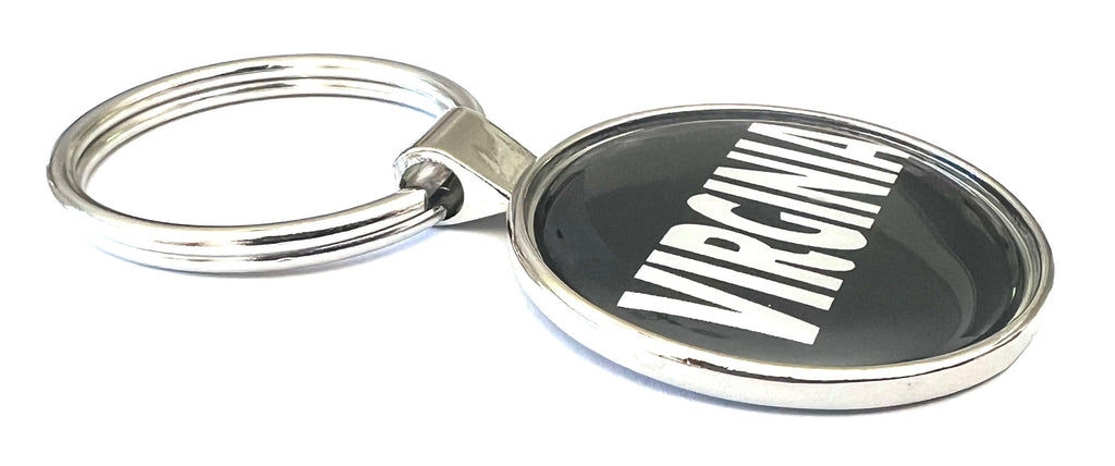 Virginia Black Graphic Text Keychain created by artist Mary Ellis. This metal keychain measures 1.25 inches by 2.5 inches and features a hard resin dome finish and shiny reflective chrome metal backing. Made in the USA. Make a perfect Virginia souvenir gift.