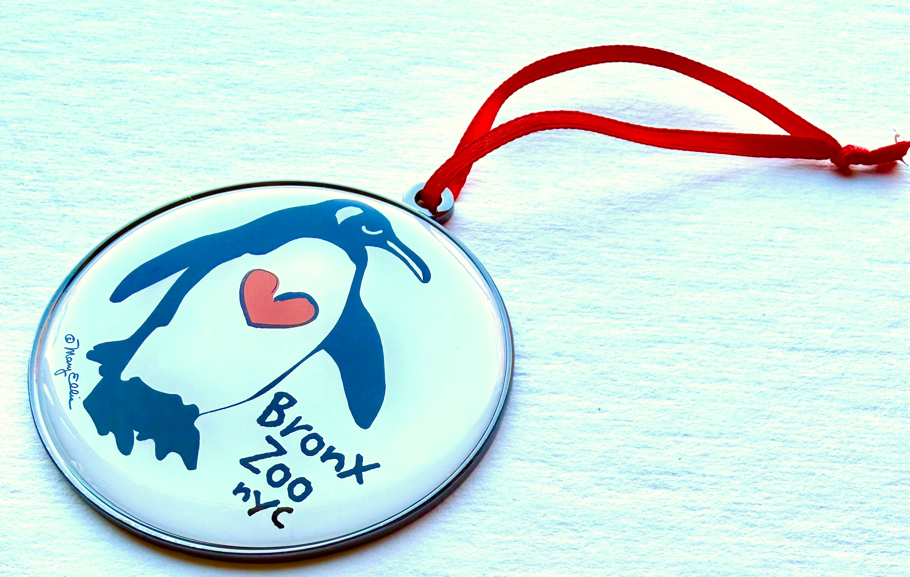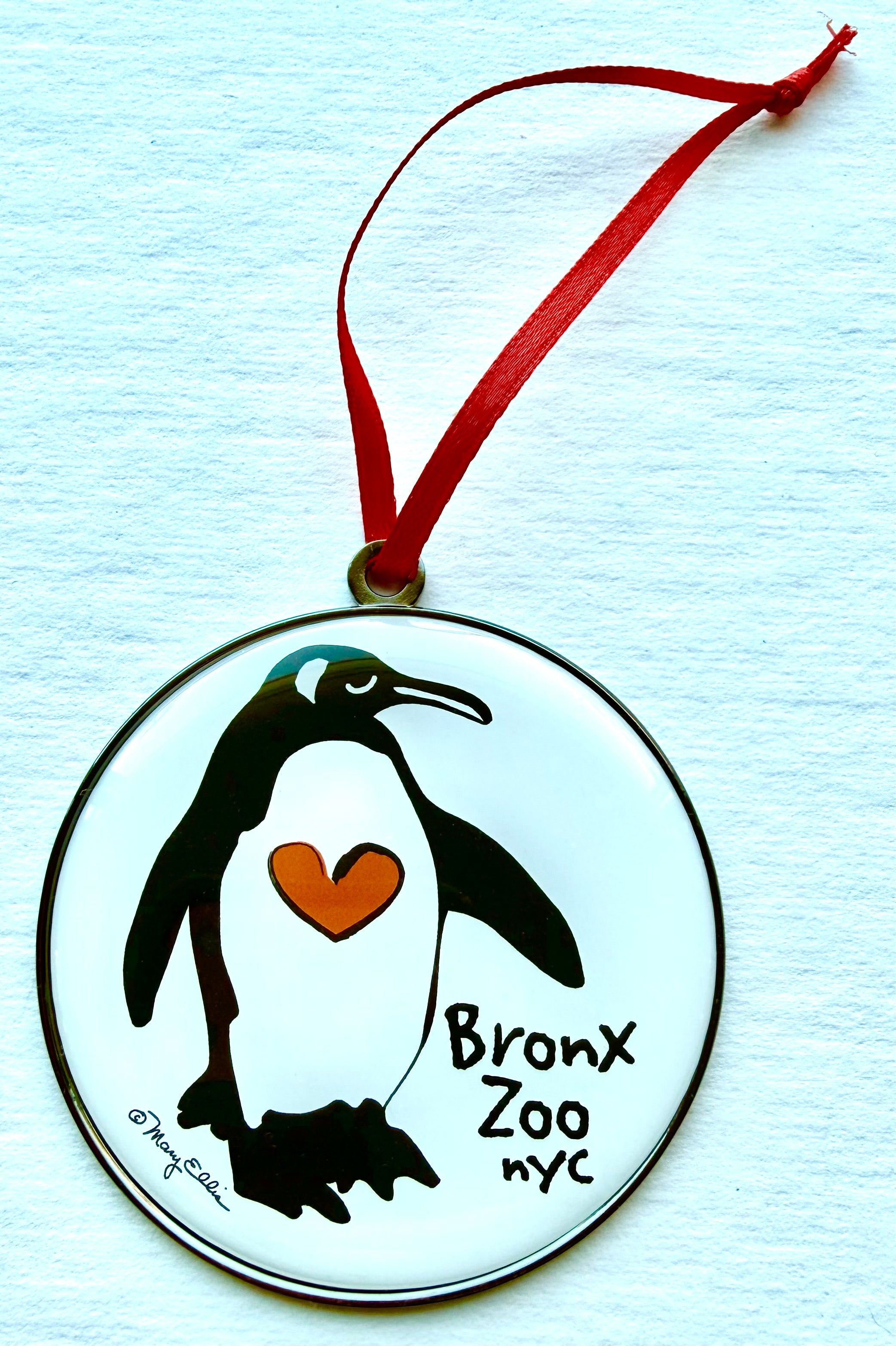 2.5" dome Custom Zoo or Aquarium Christmas ornament created by Mary Ellis featuring customizable Penguin Heart Zoo artwork. This ornament features a resin dome over brilliantly colored original artwork with a reflective chrome backing. It comes with an attached red...