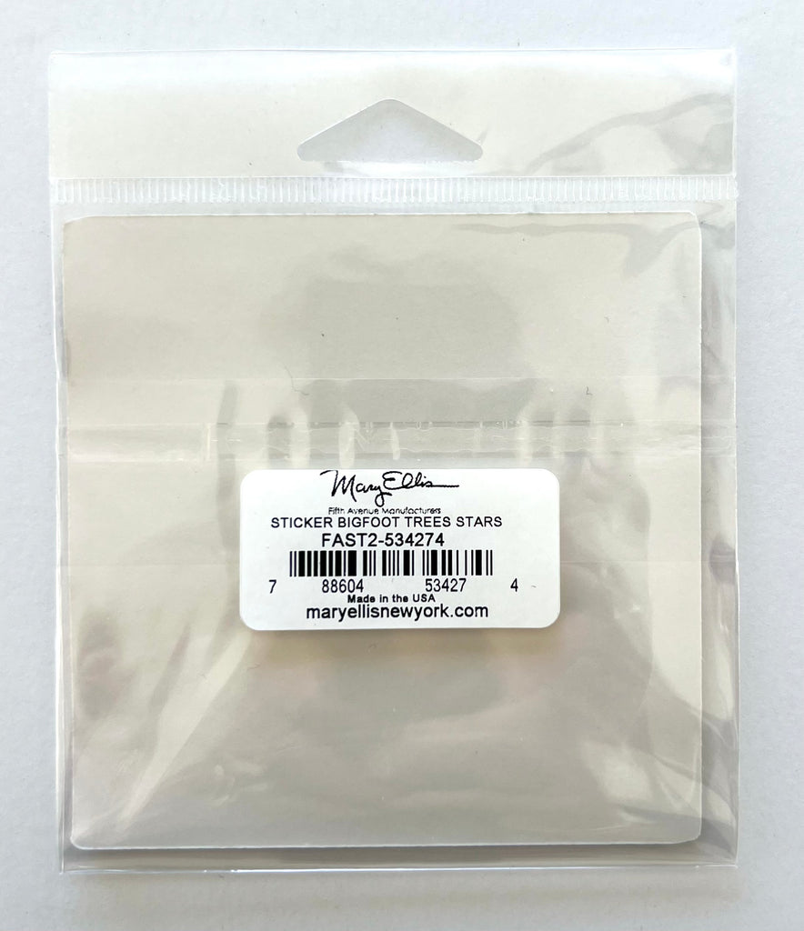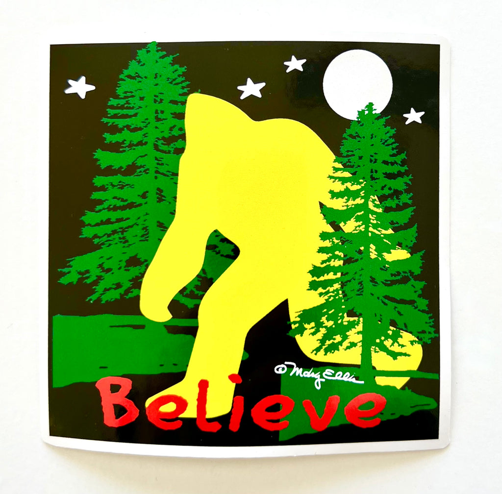 Bigfoot Giant 4" Sticker with bright and glossy Sasquatch Stars and Trees artwork by artist Mary Ellis with the word "Believe". Perfect to stick on a water bottle, notebook, or wherever you can imagine!